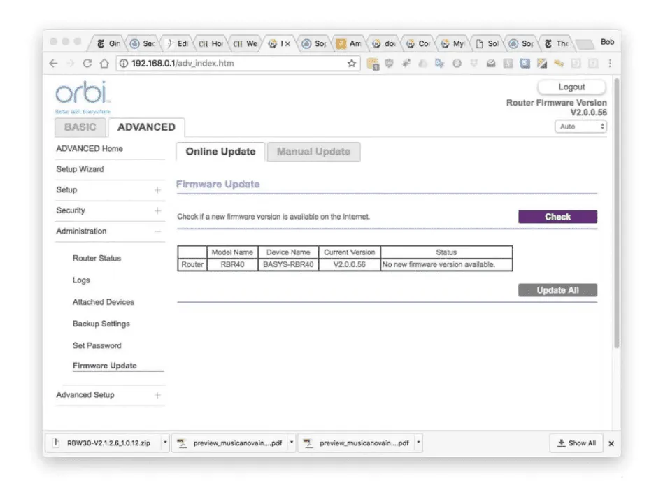 In Online update options, you will see the details of your Orbi model and the current firmware version of the orbi router and each satellite. Click on the check button to get know the information about the latest version of firmware and then click on update all.